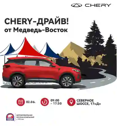 Приглашаем вас в путешествие в мир скорости, комфорта и драйва с Медведь-Восток!Регистрируйтесь на клиентское мероприятие CHERY-ДРАЙВ в воскресенье 2 июня с 09:00 до 17:30 на автодроме «Медведь Холдинг»!