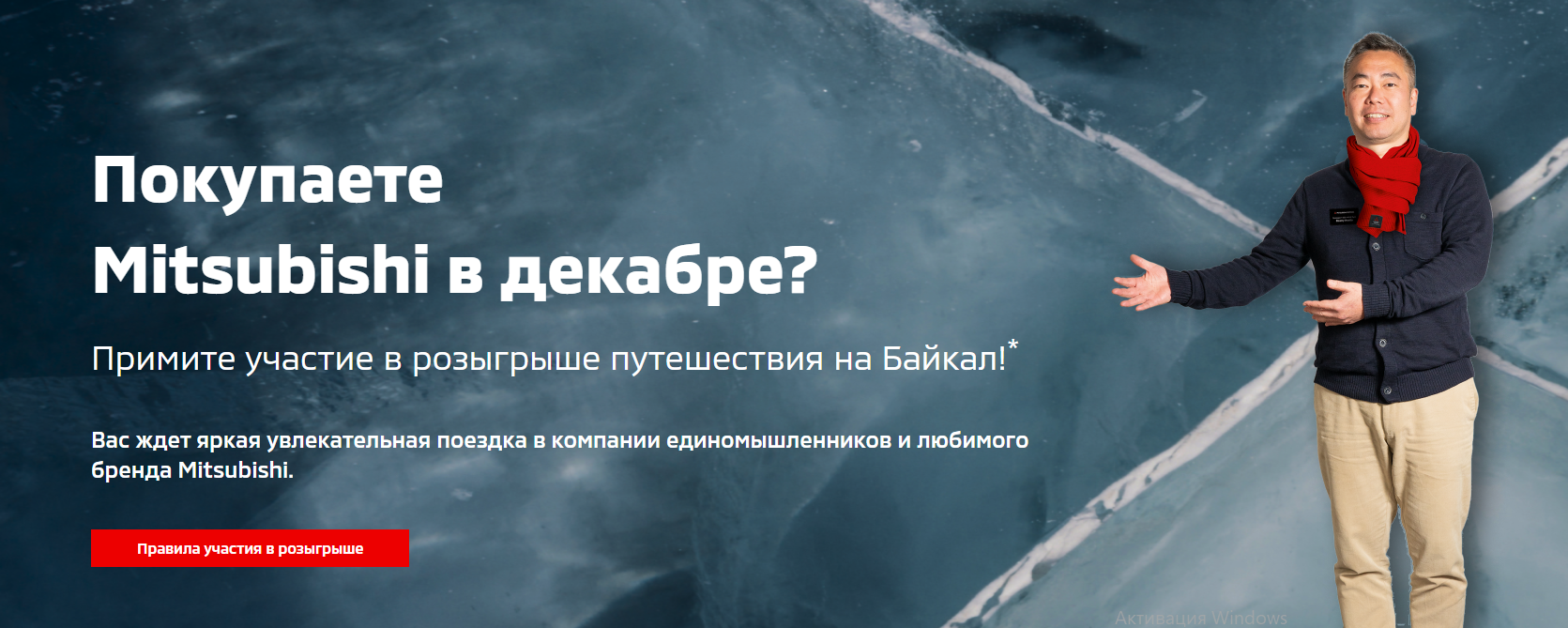 * Стимулирующее мероприятие «Путешествие на Байкал с Mitsubishi» (далее — Акция). Сроки проведения акции с 01.12.2021 года по 31.03.2022 года, включая период заключения Договора купли-продажи автомобиля Mitsubishi в официальных дилерских центрах Mitsubishi Motors в России в срок с 1 по 30 декабря 2021 г. Организатор Акции — ООО «РОВЕРТАСК». Ознакомиться с информацией об организаторе акции, о правилах ее проведения, сроках, количестве призов, месте и порядке их получения можно узнать по ссылке — Полные правила.