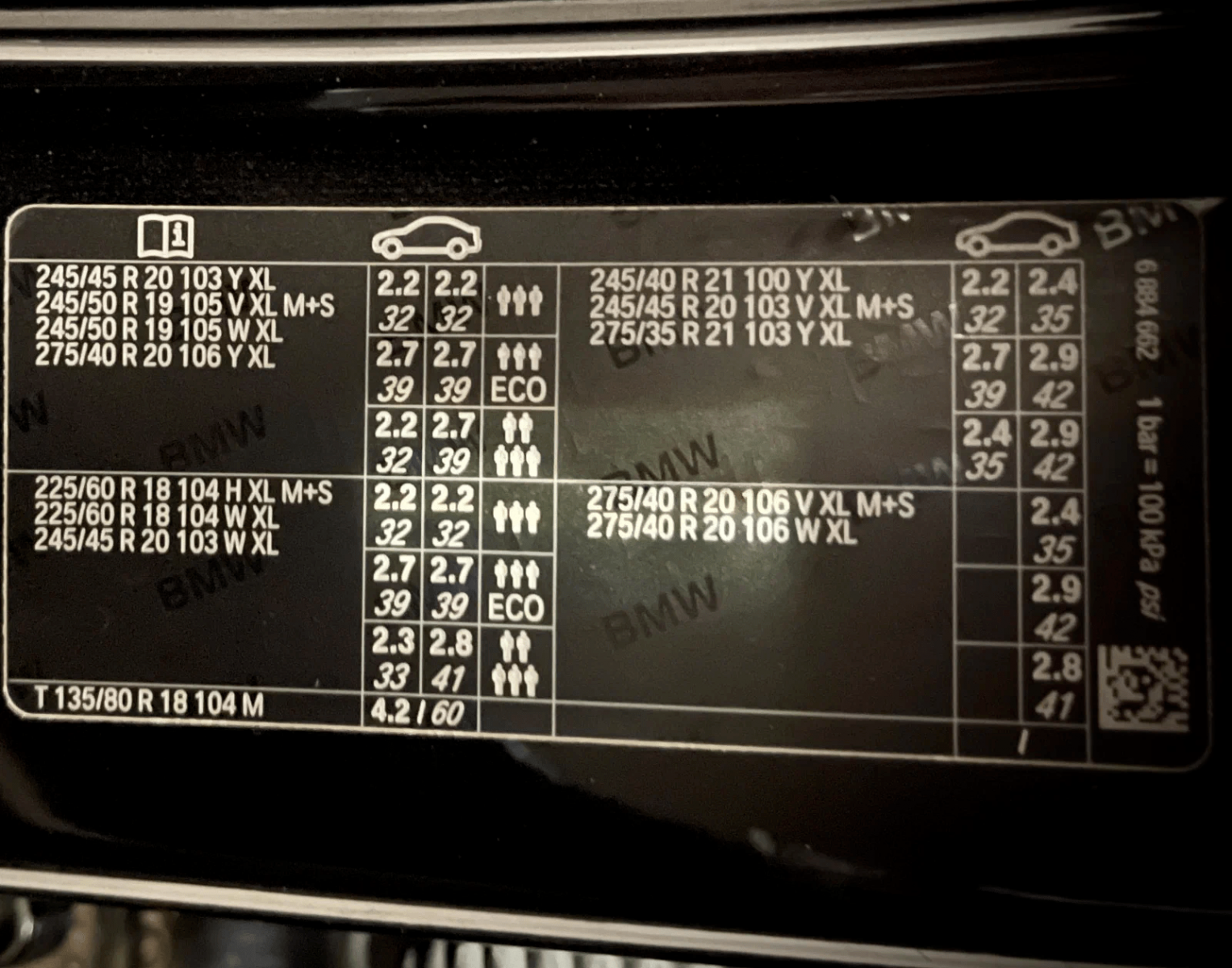 Их можно найти в инструкции к автомобилю, но быстрее и проще изучить стикер, который на заводе наклеивают в проёме водительской двери или на лючке бензобака. Там будут указаны не только допустимые размеры, но и давление, до которого рекомендуется накачивать покрышки.